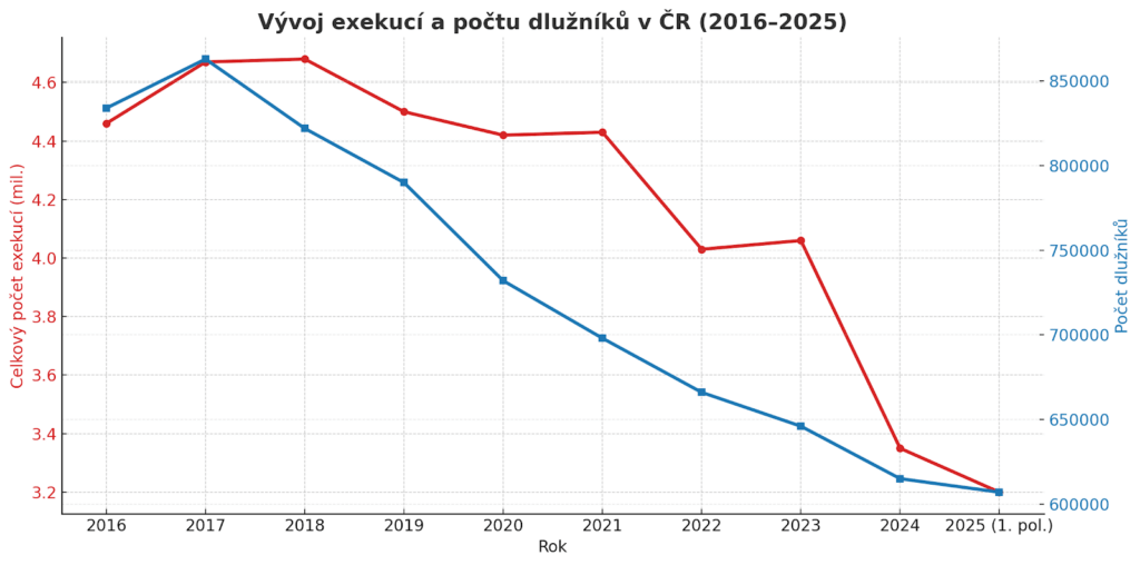 K 1. 9. 2025 bylo evidováno více než 3 miliony exekucí vztahujících se na více než 603 tisíc osob.
