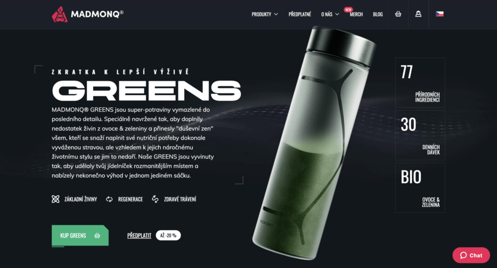 MADMONQ Greens představuje zelený nápoj obsahující 62 přírodních složek a živin. Jeden sáček nahrazuje jednu porci ovoce a zeleniny a obsahuje trávicí enzymy společně s probiotiky pro zdravé trávení. Balení s 30 porcemi stojí přibližně 1 295 Kč při jednorázovém nákupu.
